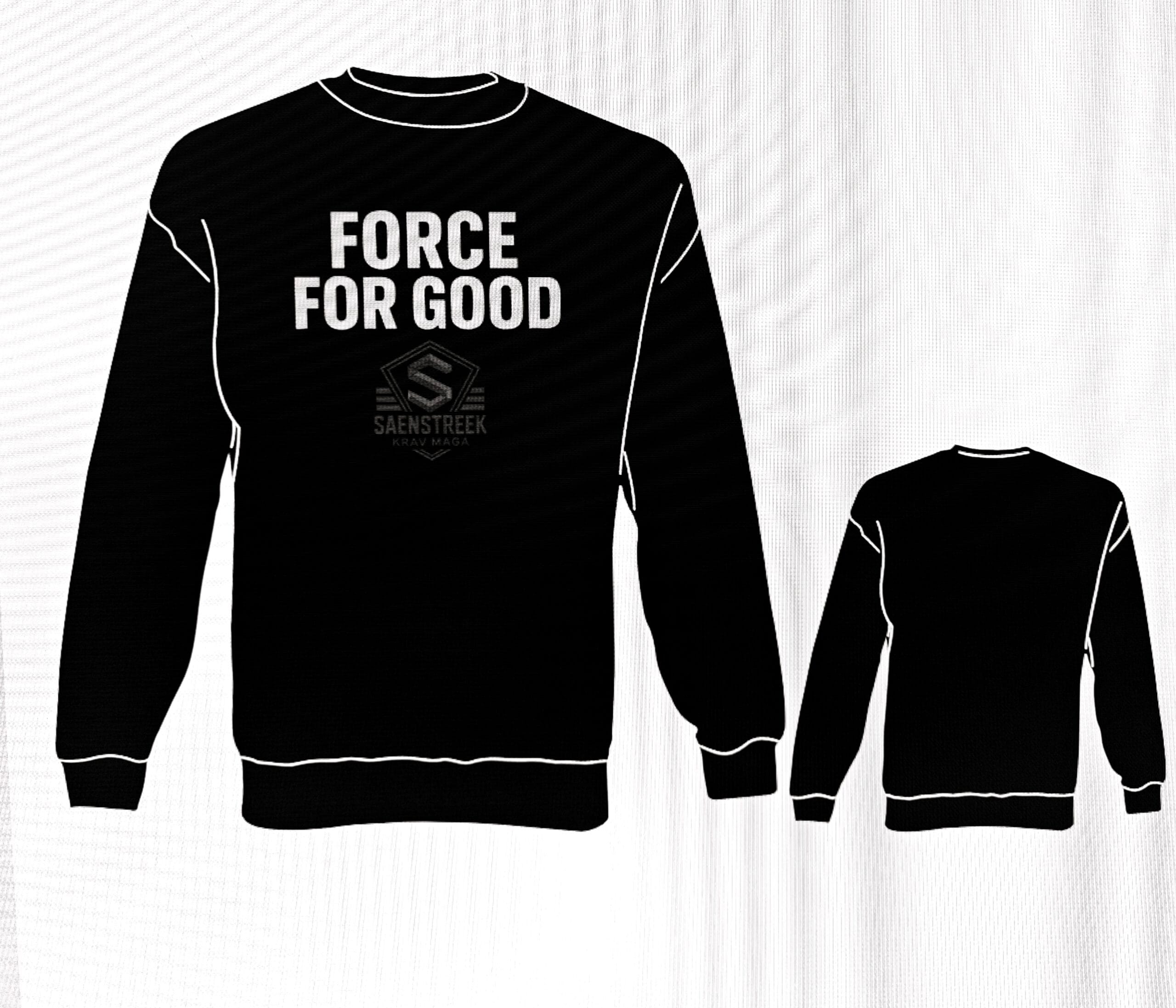 Kwaliteits stof met zak met ritssluiting op de mouw met de tekst Force For Good en het Saenstreek stealth Logo